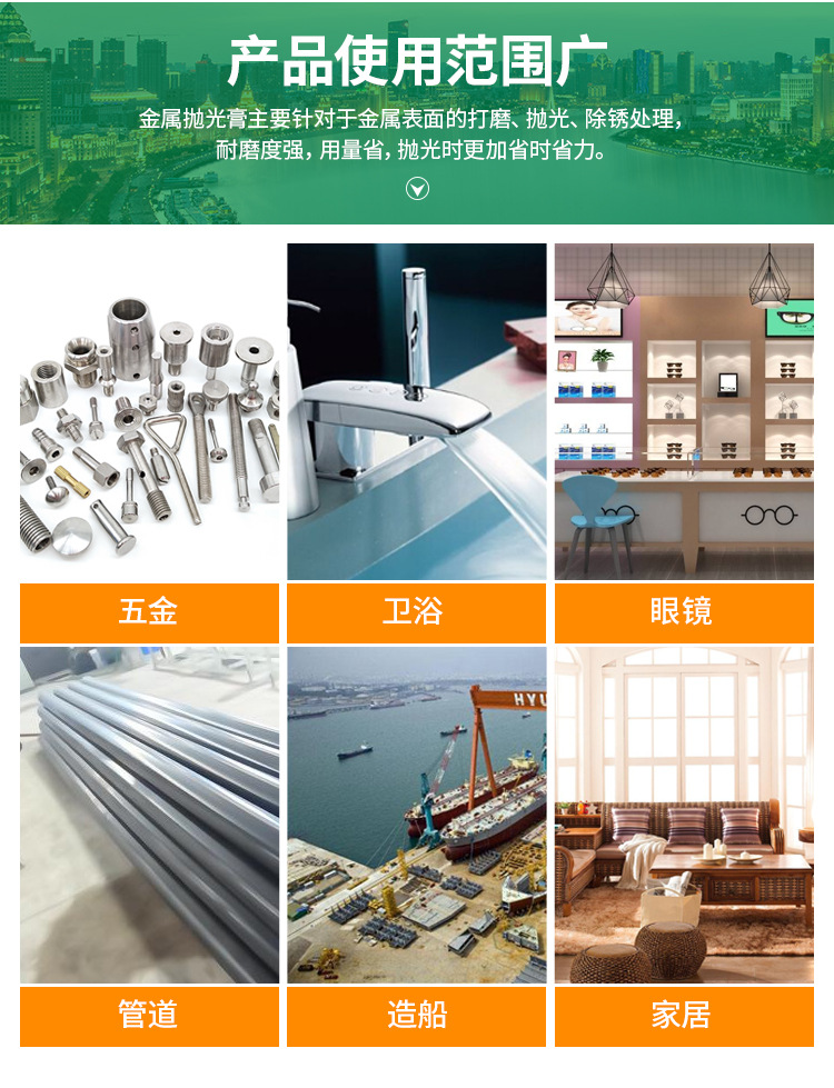 金屬鏡面拋光膏 磨光拋光膏采用高強全樹脂砂布為原材料,使用高強粘度樹脂膠,產(chǎn)品質(zhì)量穩(wěn)定,外觀美觀。適用行業(yè)非常廣泛,可用于各類金屬、非金屬產(chǎn)品表面研磨、拋光。