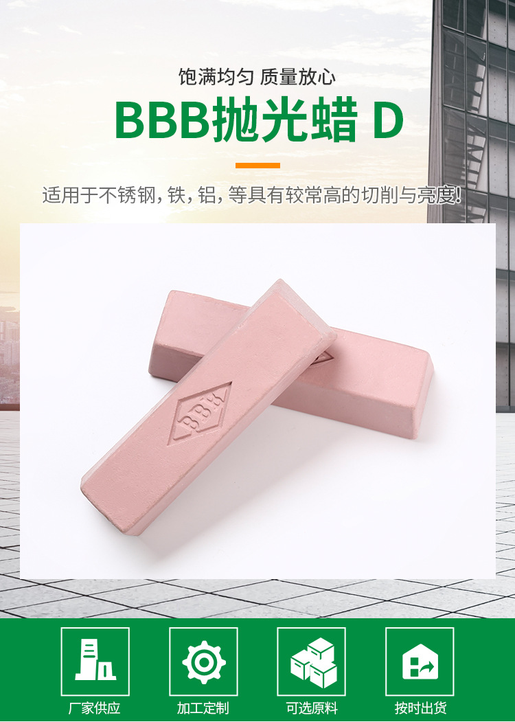 溫州華銘拋光研磨材料有限公司提供的bbb粉色拋光蠟(拋光臘)可用于金屬、不銹鋼、木雕玉石等固體打磨拋光用,可以增加金屬、不銹鋼、木雕玉石等固體光澤,保護(hù)產(chǎn)品漆膜免受潮濕、劃傷與灼傷的作用。正確地使用上拋光蠟可使產(chǎn)品更富于光澤。