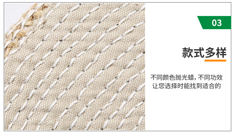 劍麻主要產(chǎn)于廣西本產(chǎn)品屬廣西很好的劍麻不偷片經(jīng)多道工序制作而成!對(duì)五金,眼鏡,拋磨有著耐磨不脫毛等特點(diǎn)!大小規(guī)格可按客戶加工!麻轆:可分為油麻轆和布麻轆。麻轆采用優(yōu)良劍麻為原材料,經(jīng)再三深加工布成為一種堅(jiān)硬的拋光材料,油麻轆主要用于不銹鋼制品自動(dòng)拋光生線,布麻轆通常用于拋金屬制品,種類齊全,規(guī)格有直徑50mm——500mm不等